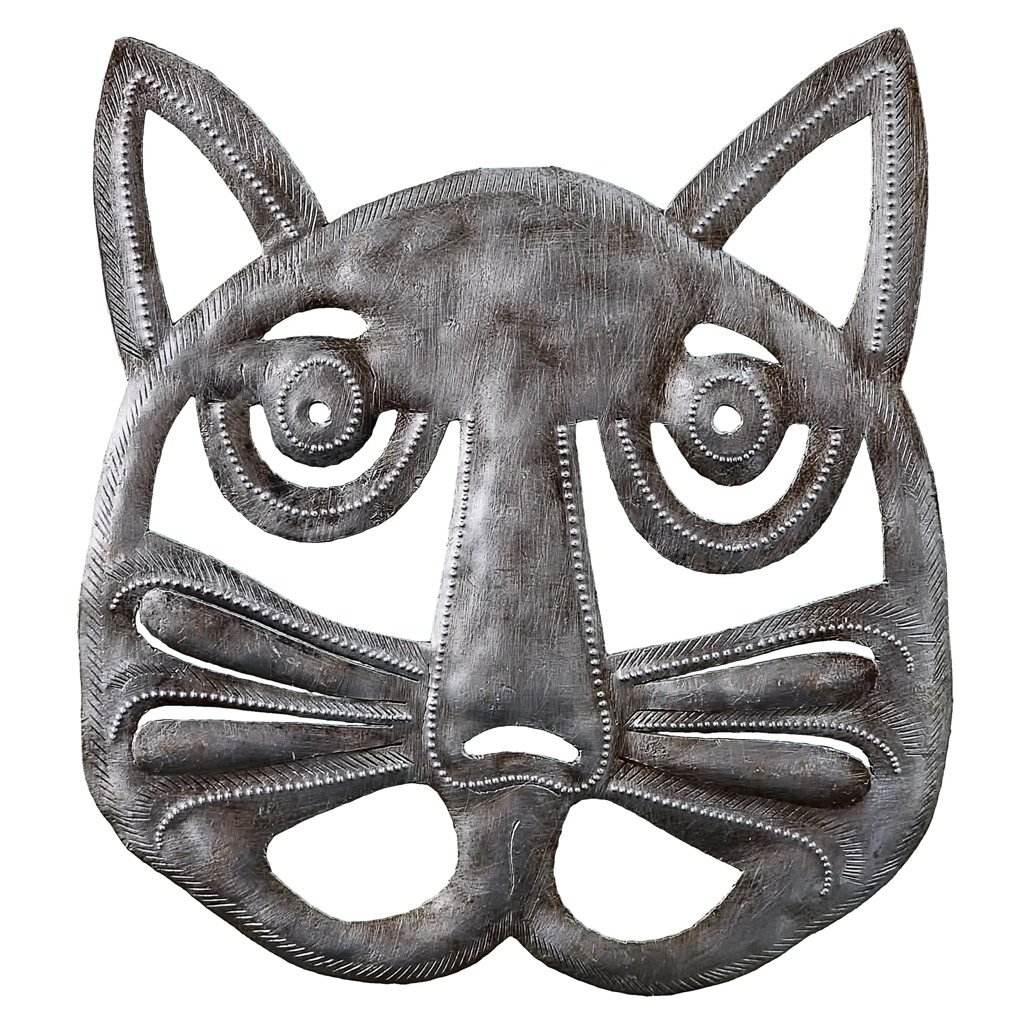 Perfect for home or garden, each Cat Head is approximately 8.5″ x 9.5″ x 0.5″ and hand-chiseled out of recycled steel oil drums by Haitian artisans using techniques first developed by Georges Liautaud in the late 1950s when he chalked out his first design on a flattened steel oil drum and then cut it out by hand with a mallet and chisel. As each piece is handmade, their final dimensions and finish may vary slightly.