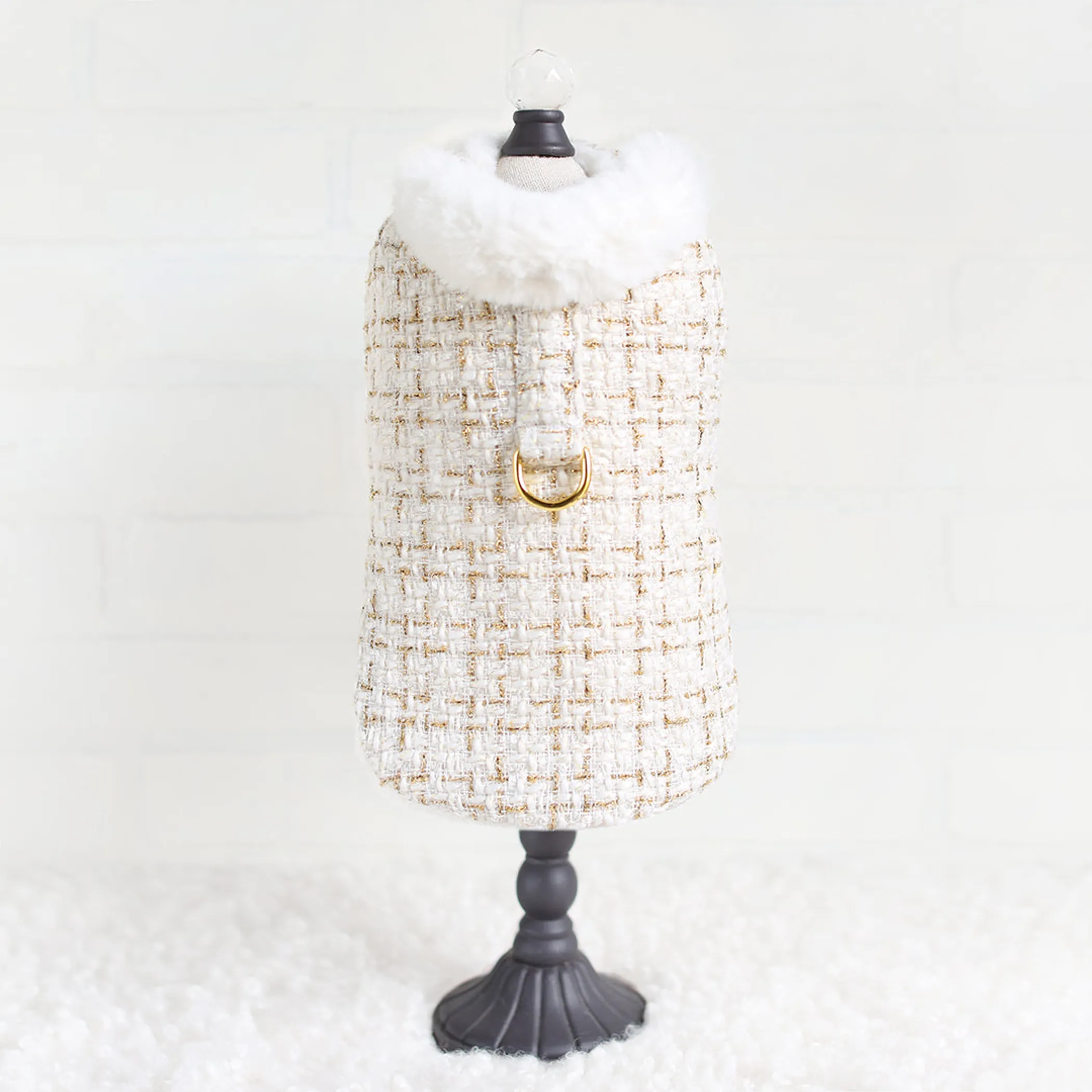 Your precious pooch will look regal in the Chantel Tweed Dog Coat by Hello Doggie. Our new coat collection was released just in time for the fall/winter season. When designing this coat we had the pooch in mind, our fur babies get cold too while they’re out on the town for holiday shopping or a walk in the park. The coats are made from a beautiful soft tweed fabric and are lined with faux fur for a timeless design and to keep out that extra chill. These coats are perfect to pair up with your favorite Hello Doggie sweater, featuring adjustable velcro straps for a perfect fit when adding layers. It is easy to care for, delicate wash with no softener or bleach and air dry. Our coats are fashionable and most importantly comfortable to wear. Each Coat has a matching harness, sold separately._x005F_x000Dx005F_x000D_ _x005F_x000Dx005F_x000D_Limited Edition_x005F_x000Dx005F_x000D_>MSRP$84.00_x005F_x000Dx005F_x000D_ _x005F_x000Dx005F_x000D_* Coats are handmade sizes may vary slightly. Made in USA.