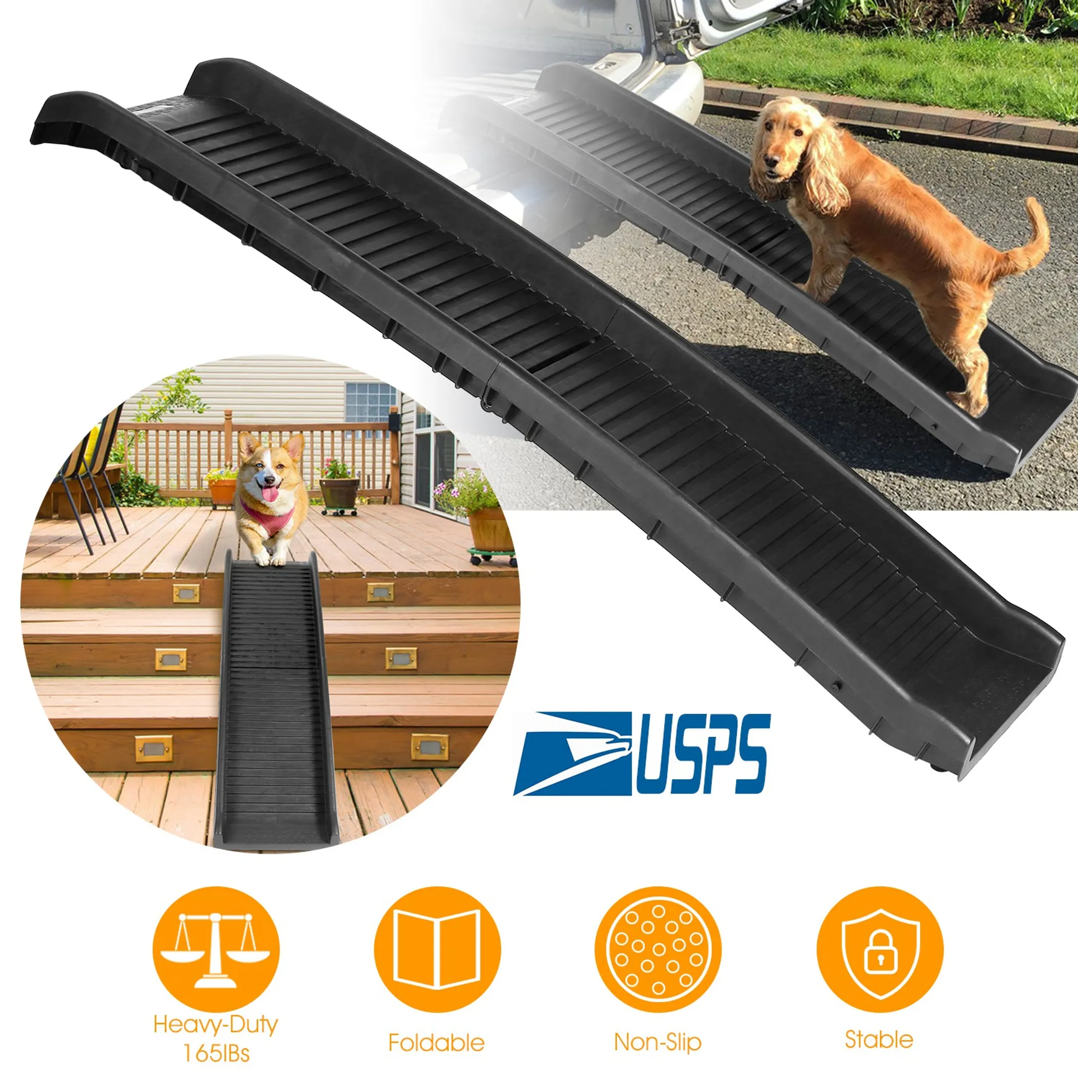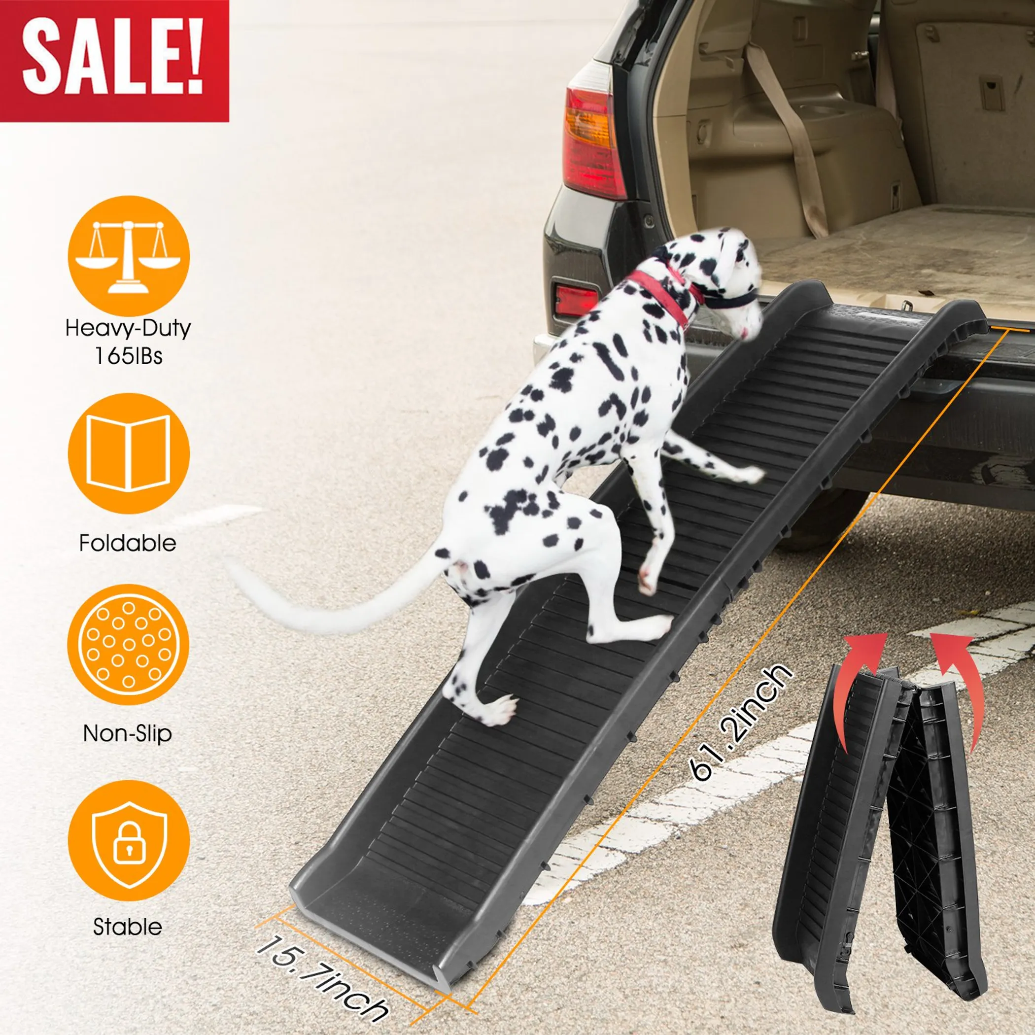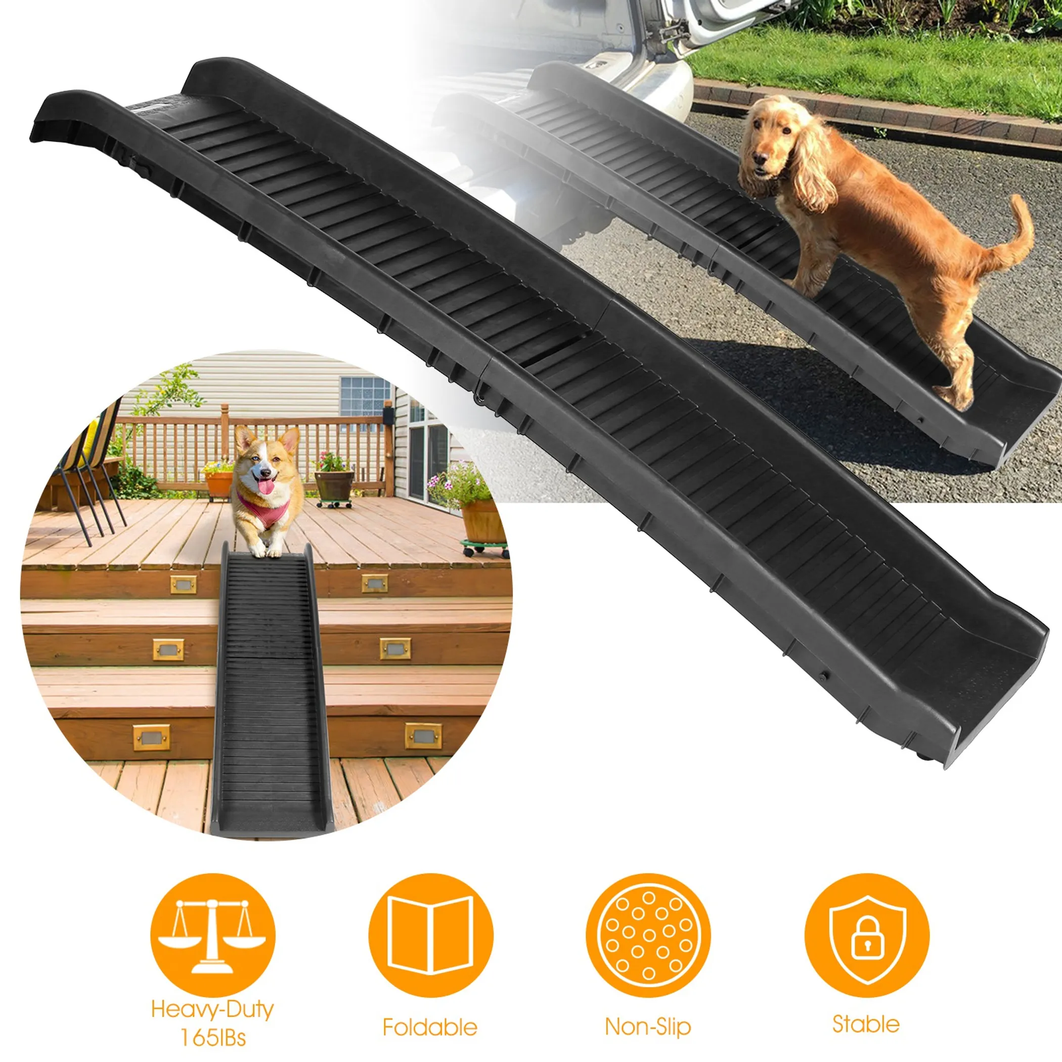 Did you ever try to find a way for your elder or injured pet to go up and down without causing too much fatigue and pain? Do you want to be hands-free to get your heavy large dog on and off the car safely? This foldable pet ramp is perfect for your furry friends. The high traction and skid-proof design can reduce the strain on pet’s joints and back, and enables your pet walks in the car steadily and safely. The pet ramp can be used for your car, truck, SUV, porch stairs, or in your house.