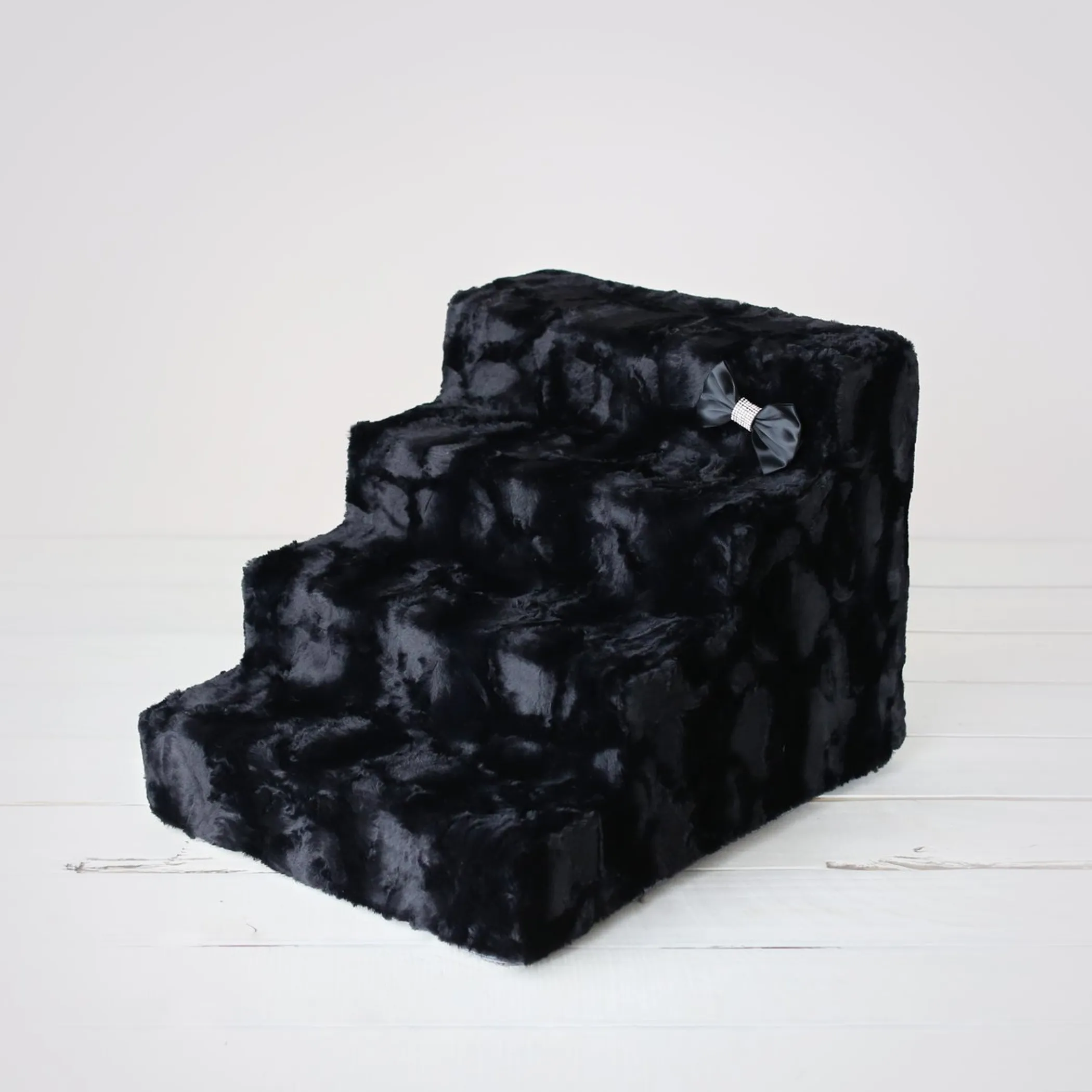 Luxury Pet Stairs handmade by Hello Doggie, covered in soft and silky luxurious fabric with a removable satin crystal bow to add a royalty feel to your home! Perfect to help your pet with a boost around the house for high couches and beds for safety and comfort to spend more time with Mommy and Daddy! High-density foam provides the perfect balance of stability and support. With a removable covered zipped up to perfection, these pet stairs can be washed and re-zipped back for a nice clean look every time! Gentle Wash, Tumble Dry low.