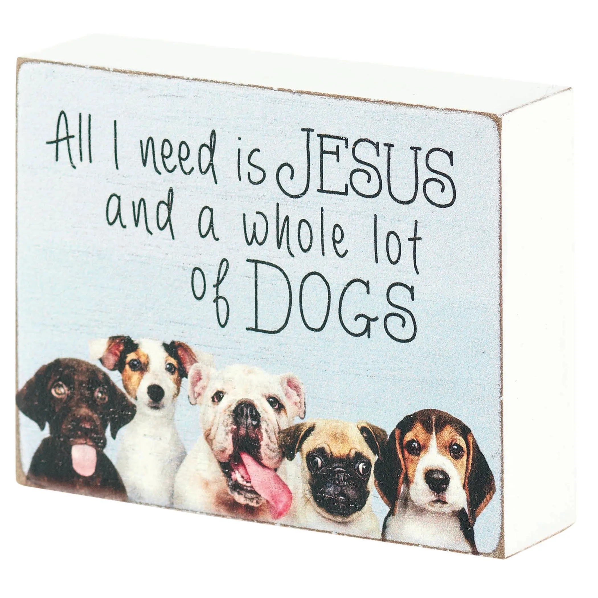 This fun plaque displays a plethora of adorable pooches and the words “All I need is Jesus and a whole lot of dogs.” Tabletop plaque measures 4″ x 3″ x 1″; sides and back have a white wash finish. Made of MDF wood.